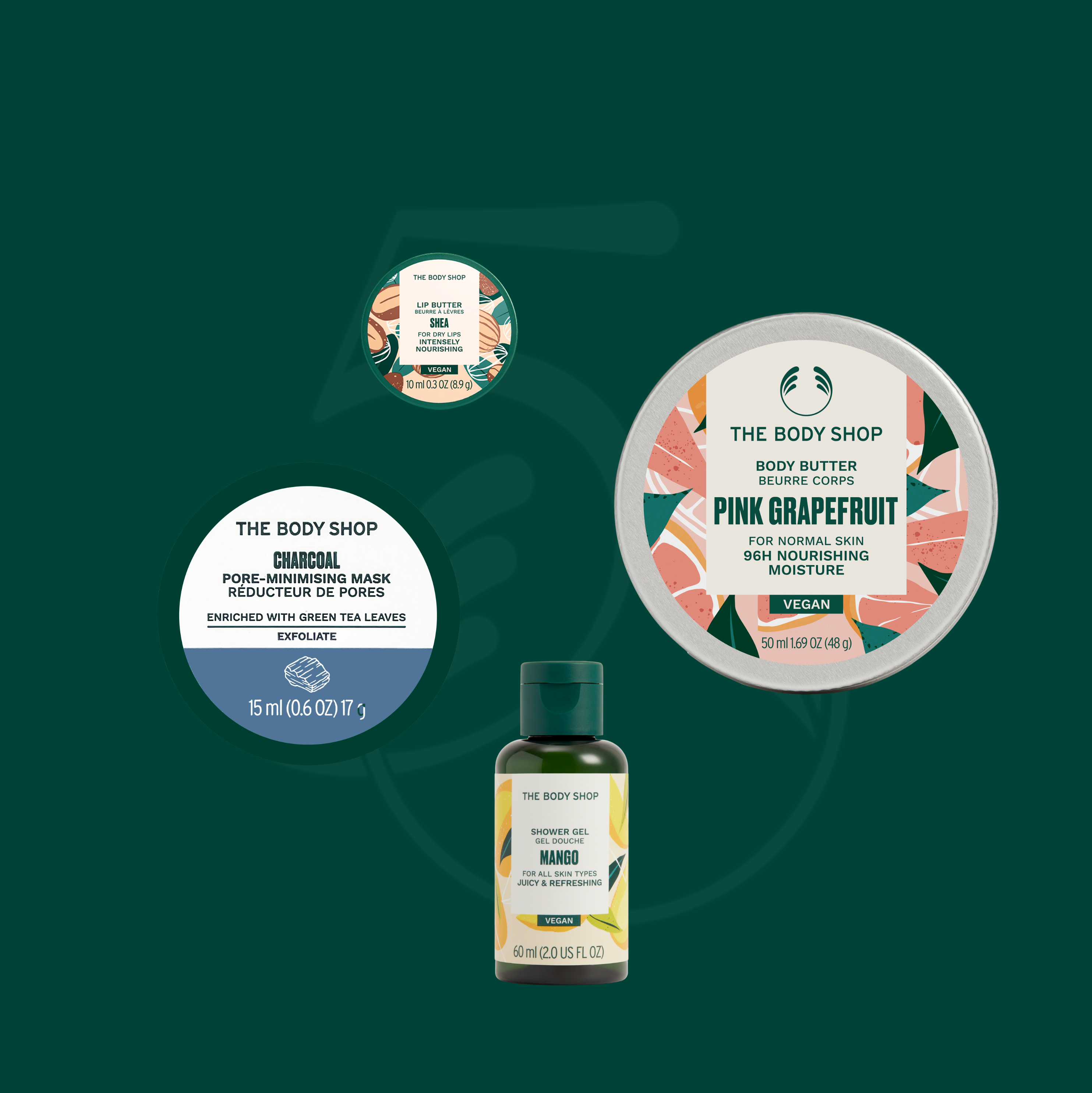 Gaven indeholder Mango Shower 60ml, Pink Grapefruit Body Butter 50ml, Shea Lip Butter og Charcoal Facial Mask 15ml.